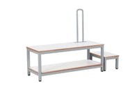 Muksu-pukemispenkissä on magneetilla siirrettävä askelma, jonka saa laitettua penkin eteen tai sivuun.